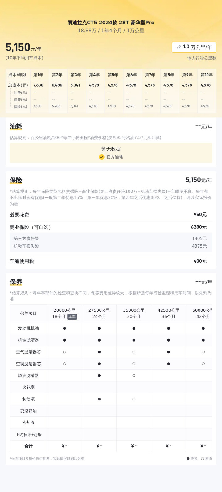 根据相关数据显示,凯迪拉克CT5 2024款 28T 豪华型Pro的10年平均用车成本大约在每年13868元左右。这一成本在同级别车型中处于适中的水平,对于追求高品质驾乘体验的消费者来说,这一成本是相对合理的。值得指出的是,用车成本会受到多种因素的影响,如油价波动、车辆维护状况、驾驶习惯等。个别年份可能会出现成本明显高于或低于平均值的情况,但这并不影响其作为评估车型长期使用成本的参考价值。