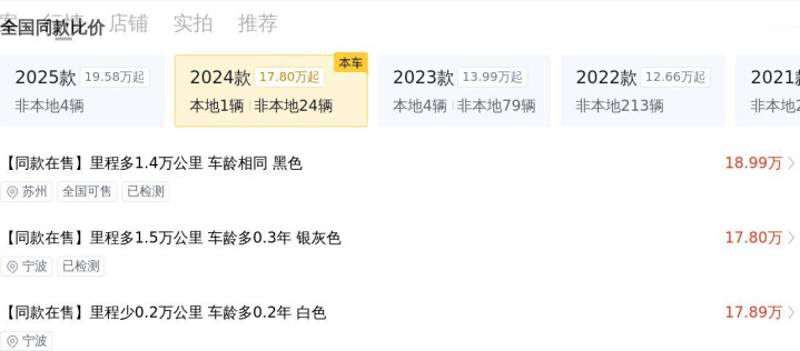 该车于2024年6月在温州上牌,至今行驶里程为1万公里,车源地与上牌地一致,车身颜色为白色,目前0过户,符合国VI b排放标准。这款车的新车指导价为29.97万元,而现在的二手车报价为18.88万元,相较于新车价格,二手车价格更具性价比。